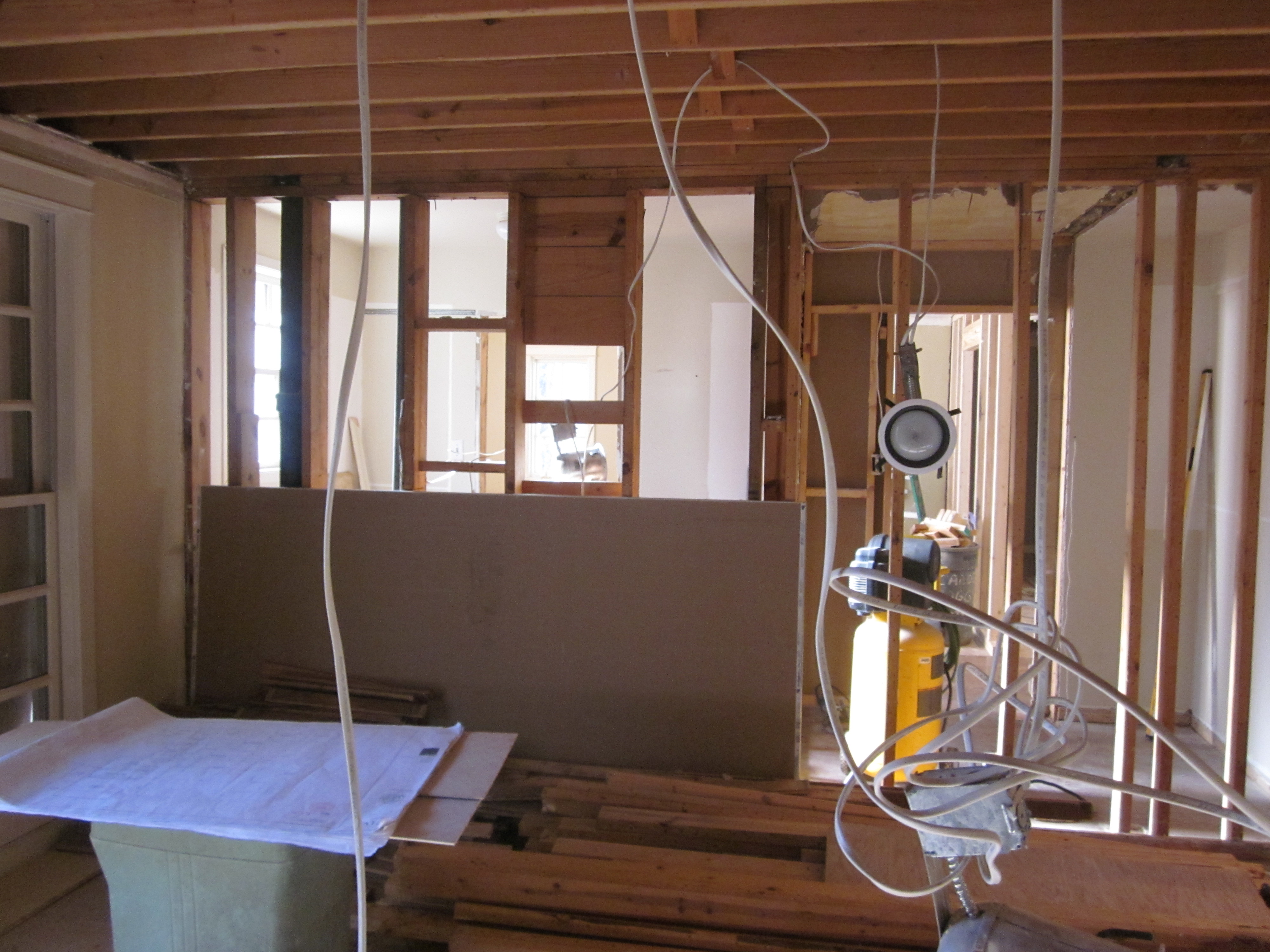 Should I venture to step out the patio door now, I would fall into a five foot pit of old bricks, broken up cement, spiky, metal rods and rotten boards filled with rusty nails. Inside, the walls have been sledge hammered out into piles of rubble. Now, there is a panoramic view from the living room smack into the master. Well. . .we were looking for more light. Now we have it.